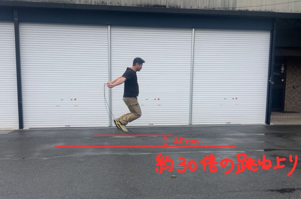 すると、「縄がどんどん伸びて、非常に跳びにくい」、「体が前に持っていかれる様な感覚がする」という点を発見したといいます。